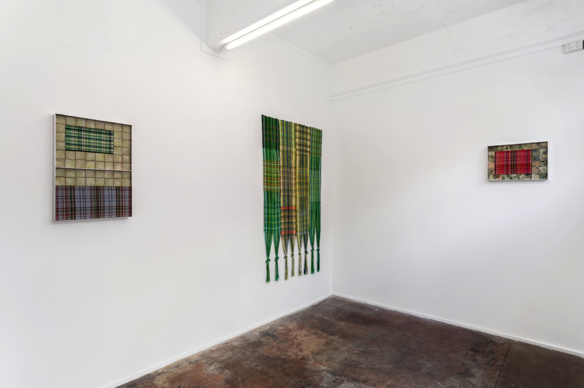 Through the action of codifying measured local, space becomes simplified and transformed into a mathematical system. However this information is duplicated, projected on to itself, and becomes a patterned complex web. The vertical warp and the horizontal weft extend beyond these pictures. They are a topographical map for the environment and time in which they came from.