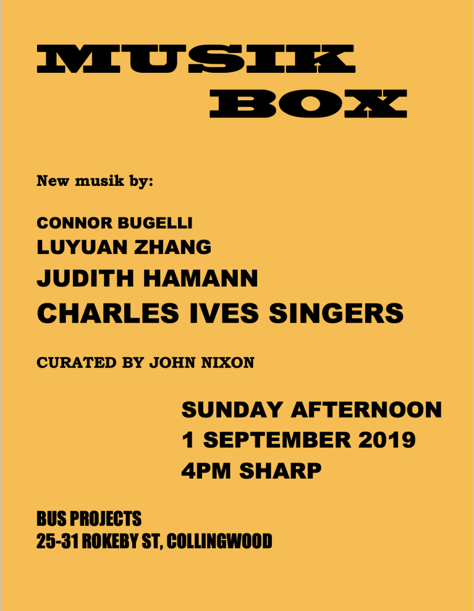 MUSIK BOX is an ongoing series of experimental music concerts featuring emerging and established artists and musicians. The upcoming concert features noise music.