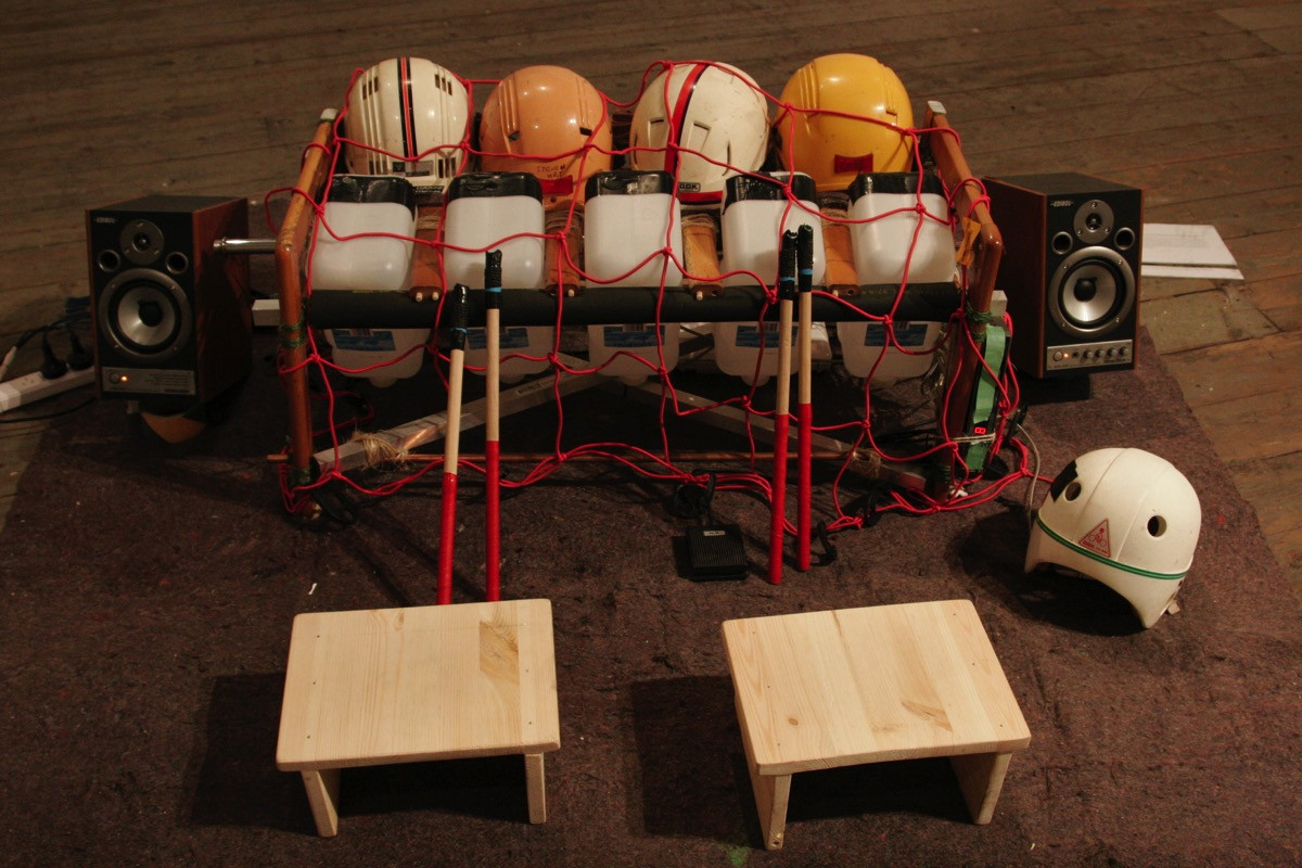 The Manifon is an idiophonic electro-acoustic instrument consisting of water jugs and bicycle helmets suspended on an ad-hoc frame. The ‘object keys’ are wired via contact triggers to a custom-made electronic instrument, running on a netbook computer. When a key is struck, the electronic instrument picks from a catalogue of recorded sounds and processes it through a musical tone, giving the sound a pitch. For example, the player might strike a water jug that gives the sound of a tree branch being snapped at the pitch of D#. The objects are ‘tuned’ to a pentatonic scale, which is utilised in traditional and folk music pan-globally.