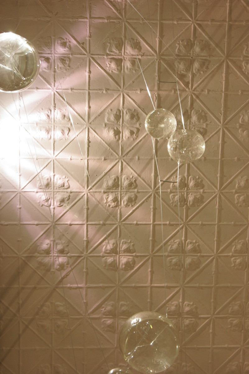 The vast architectural space of fortyfivedownstairs defines the framework for Emma Lashmar’s site-specific string instrument. The resounding of the harp/cello-like strings as they are plucked and bowed creates an audible shadow-echo of the room. A second set of strings strung with hand-blown glass spheres filled with water vibrate in response to the sounds created. The direct physical response produced by the water within these transparent objects or bodies is a visible effect that correlates to the listeners’ experience of the sounds created.