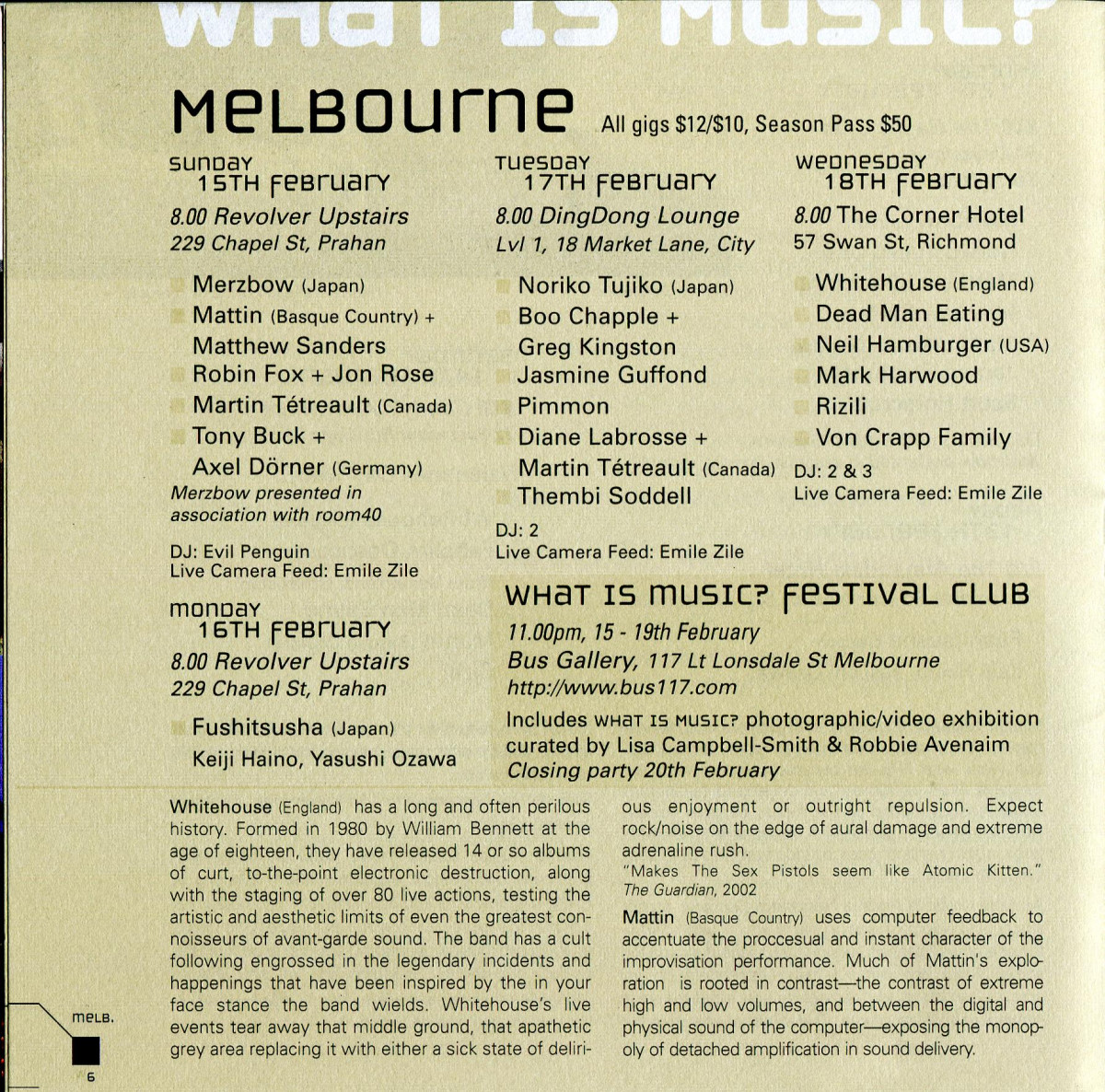 “What is Music was founded by Oren Ambarchi and Robbie Avenaim in 1994 and can rightly lay claim to significantly raising the profile of and expanding the audience for experimental music in Australia. Early festivals had a reputation for exploring the wild and anarchic, often involving rock, punk and noise cross-overs, outsider artists and performance art all thrown in with the more serious end of improvisation.”